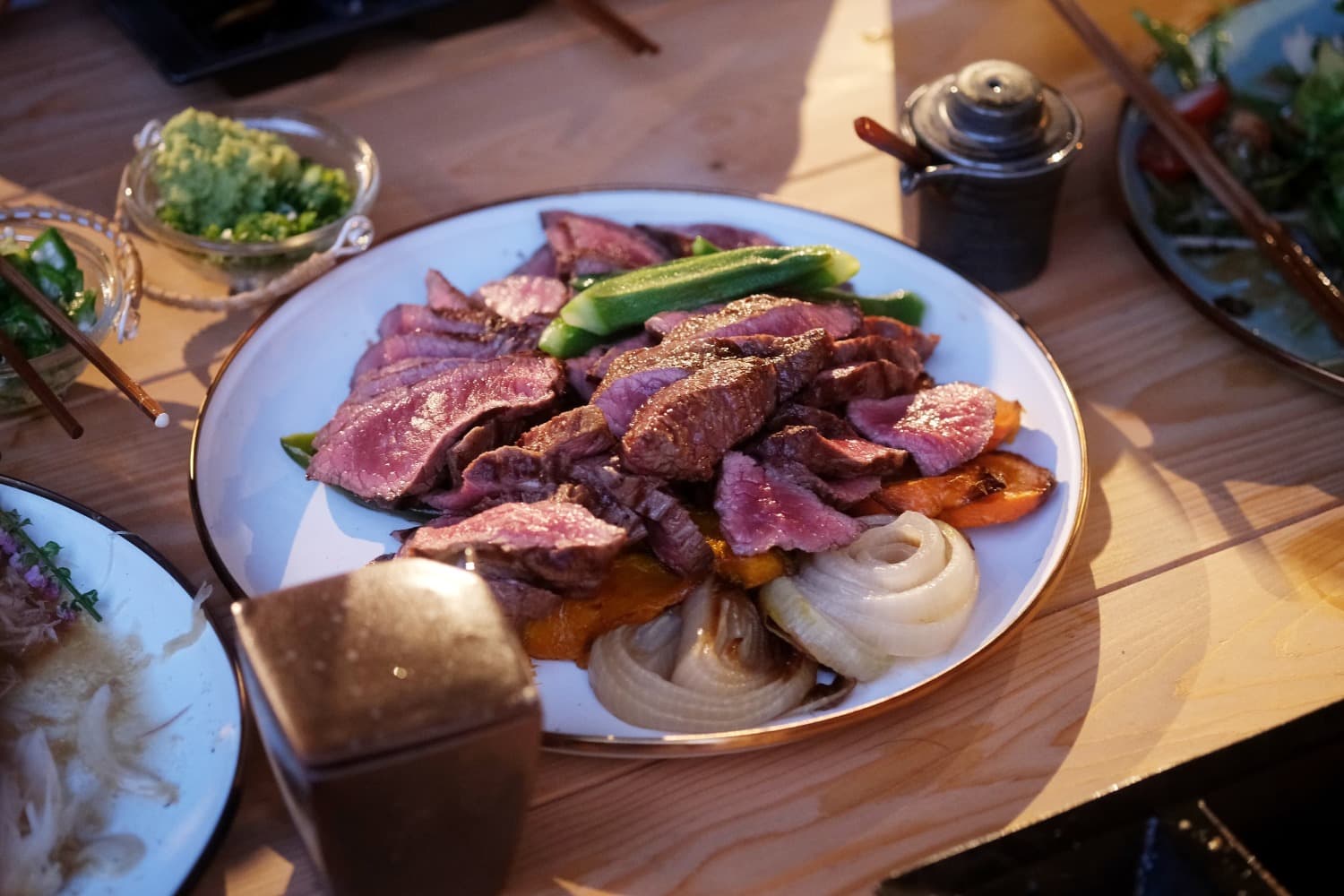 〜 鹿児島産A5黒毛和牛と朝網魚の炭火炙り焼~ 旬菜を添えて